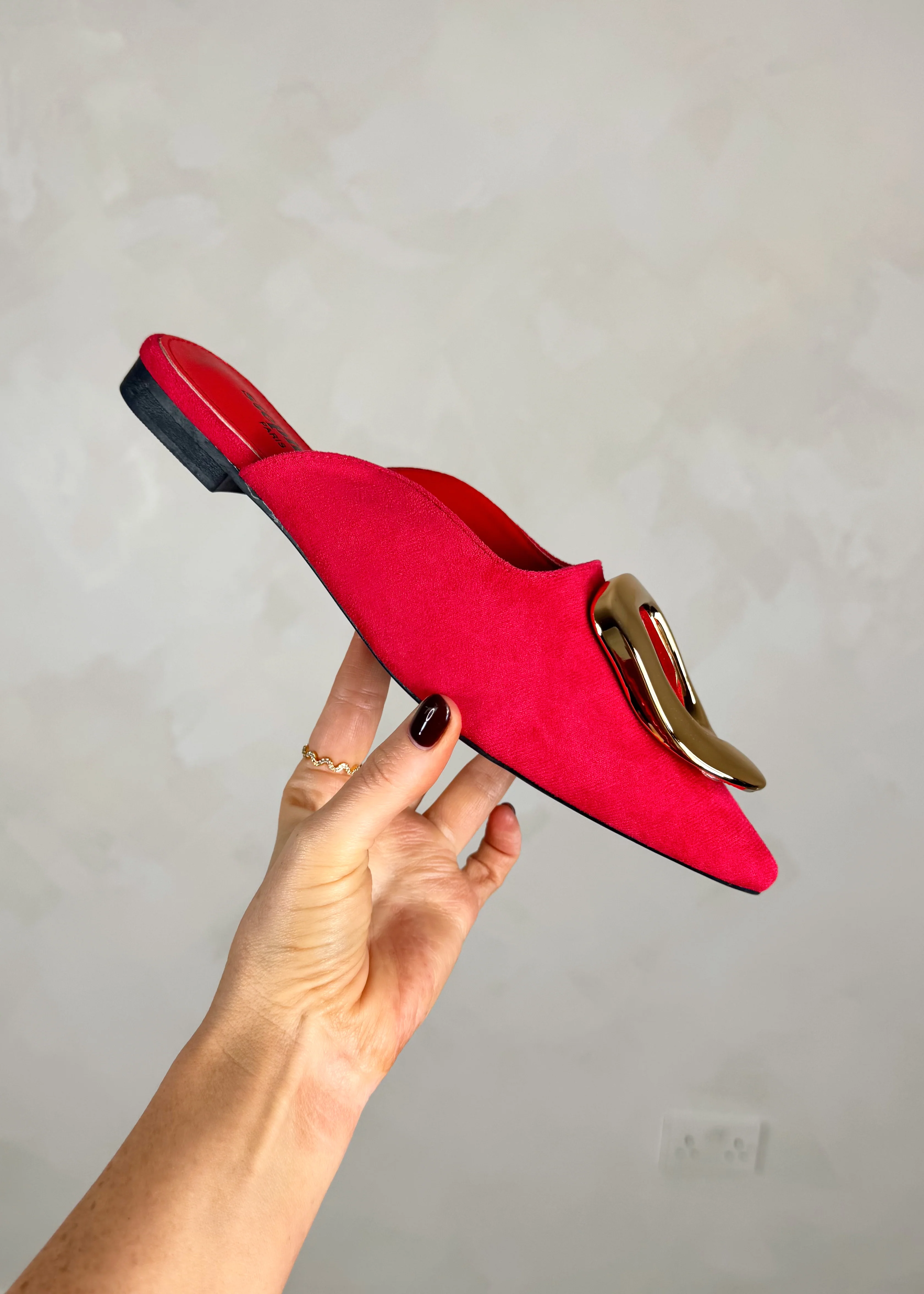 Elevate any outfit with our Bromley mule in red. The slim, pointy silhouette and gold detailing add a touch of sophistication. The suede effect provides both style and comfort. Make a statement with this exclusive and elegant design...